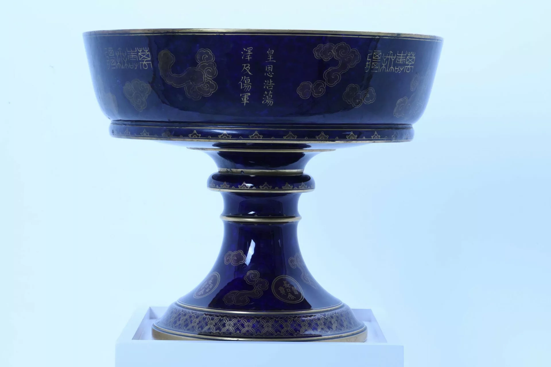 Năm 1915, triều đình Huế đã đặt ở Pháp quốc đặt 2 chiếc cúp kích thước lớn tặng nhân dịp lễ sinh nhật vua Duy Tân – kích thước: cao 390mm; đường kính miệng 460mm – Chất liệu: sứ dát vàng – Đồ án trang trí: rồng năm móng, biểu tượng độc tôn, quyền lực cai trị không giới hạn của bậc hoàng đế (không có ngoại lệ). Và đóng dấu của triều đình ở giữa (tạm dịch: Phụ Chánh Phủ ấn). Theo luật lệ triều đình, khi vua còn nhỏ (vua Duy Tan lên ngôi lúc 7 tuổi) phải lập ra phủ Phụ Chính để điều hành đất nước – Trên thân (hàng chữ dọc) có họa tiết tản vân (mây) và dòng chữ Hán ”ân vua trùm phủ – thấm đến các binh lính bị thương”. Trên thân (dòng chữ ngang) chạy quanh thân, tạm dịch “vạn thọ vô cương” (6 câu). Dưới chân trang trí tản vân (mây) và bốn chữ, tạm dịch “ phú quý mệnh trường”, do hãng DE’CORE’ – SEVRES -1915- FRANC (in dưới đáy hiện vật). Trong tổng số hai hiện vật này mà triều đình đặt về, một hiện vật đang trưng bày tại đây và một hiện vật thuộc sở hữu của bảo tàng quốc gia cung đình Huế.