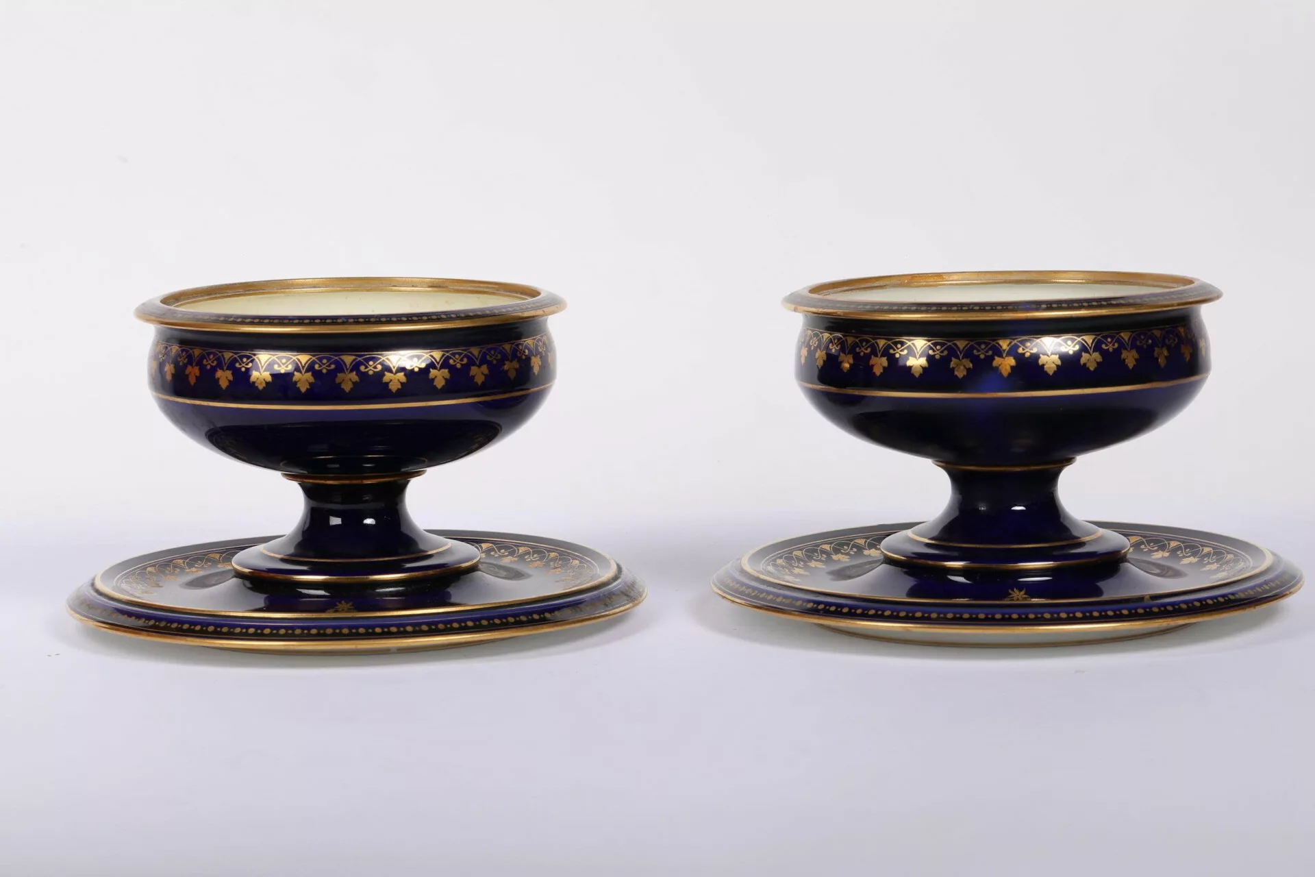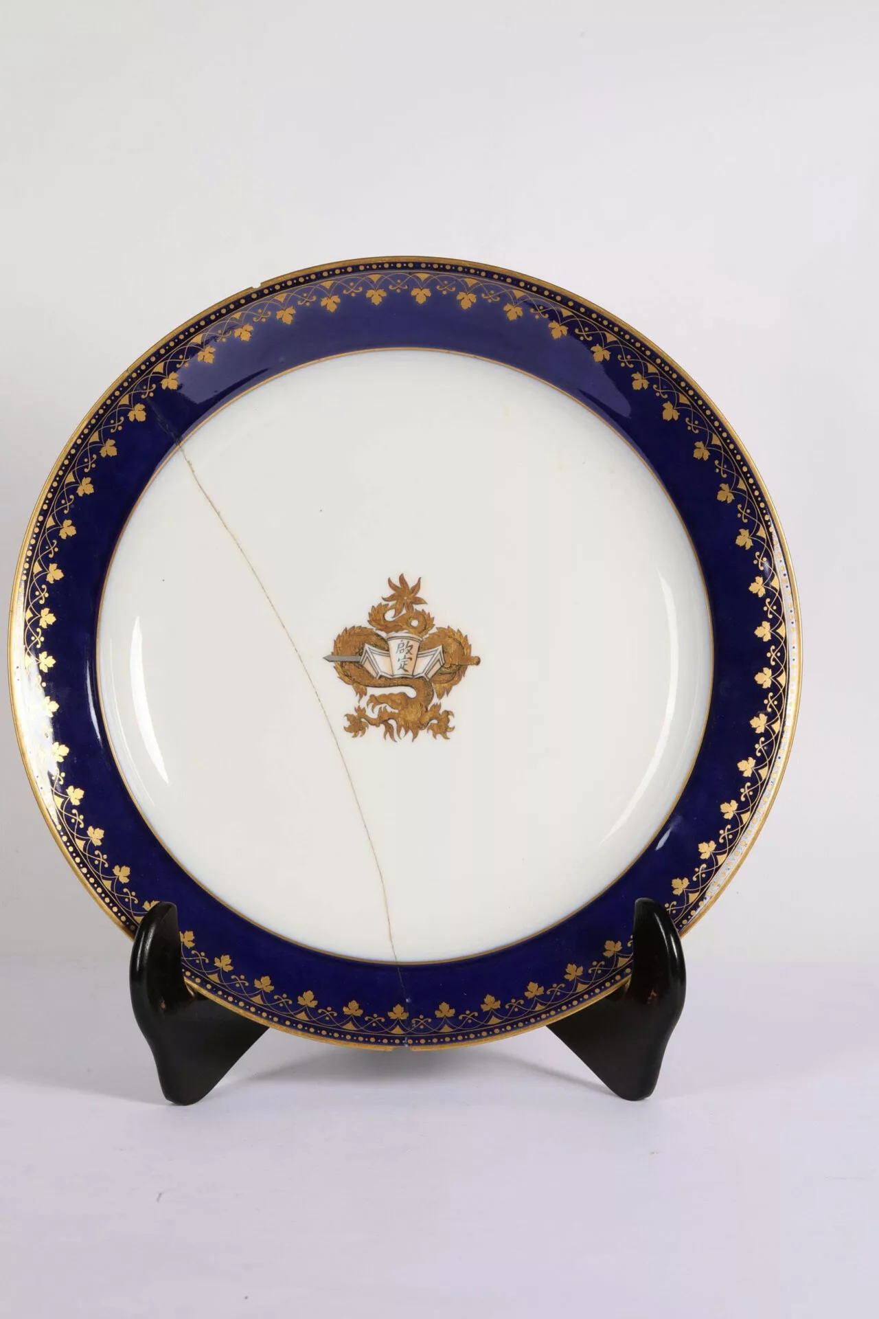 Bộ hiện vật đồ sứ dát vàng dưới đây được vua Khải Định đặt hàng tại Pháp vào tháng 5-1922, nhân chuyến công du đến Pháp dự hội chợ thuộc địa tại Marseille (lần đầu tiên một vị vua triều Nguyễn ra nước ngoài) – Trang trí: dát vàng ngay tâm dĩa và trên thân các hiện vật khác- một vương huy (huy hiệu riêng của hoàng đế); có chữ hán “Khải Định” – Do hãng DORE’A SERES – năm sản xuất 1922.