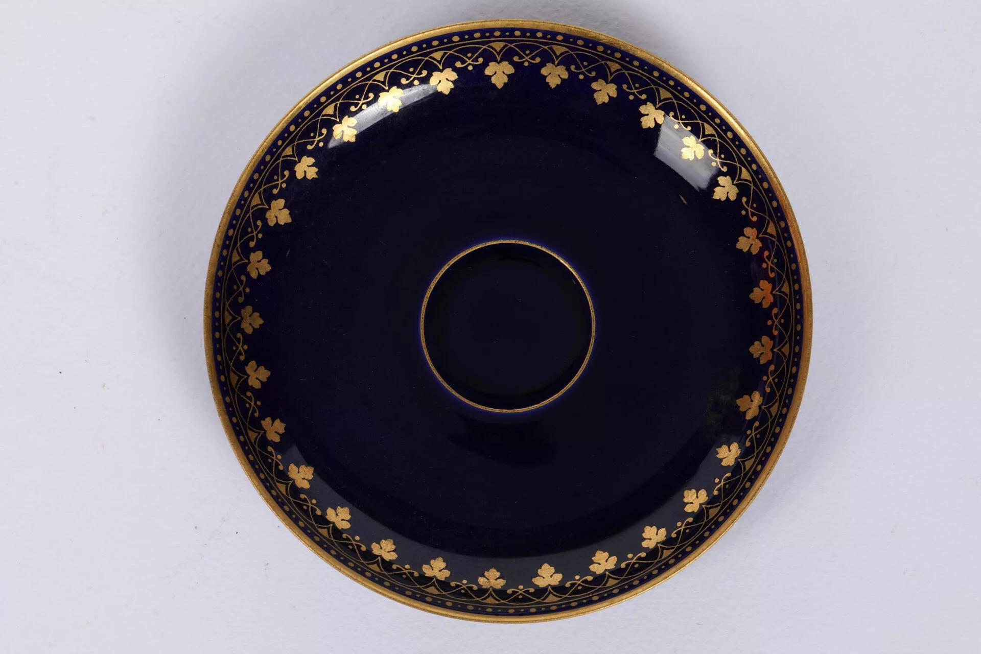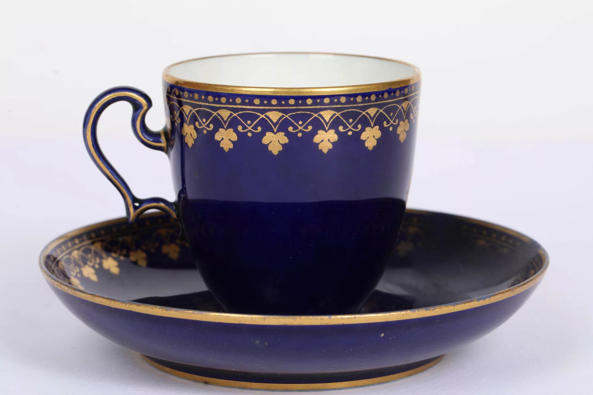 Bộ hiện vật đồ sứ dát vàng dưới đây được vua Khải Định đặt hàng tại Pháp vào tháng 5-1922, nhân chuyến công du đến Pháp dự hội chợ thuộc địa tại Marseille (lần đầu tiên một vị vua triều Nguyễn ra nước ngoài) – Trang trí: dát vàng ngay tâm dĩa và trên thân các hiện vật khác- một vương huy (huy hiệu riêng của hoàng đế); có chữ hán “Khải Định” – Do hãng DORE’A SERES – năm sản xuất 1922.