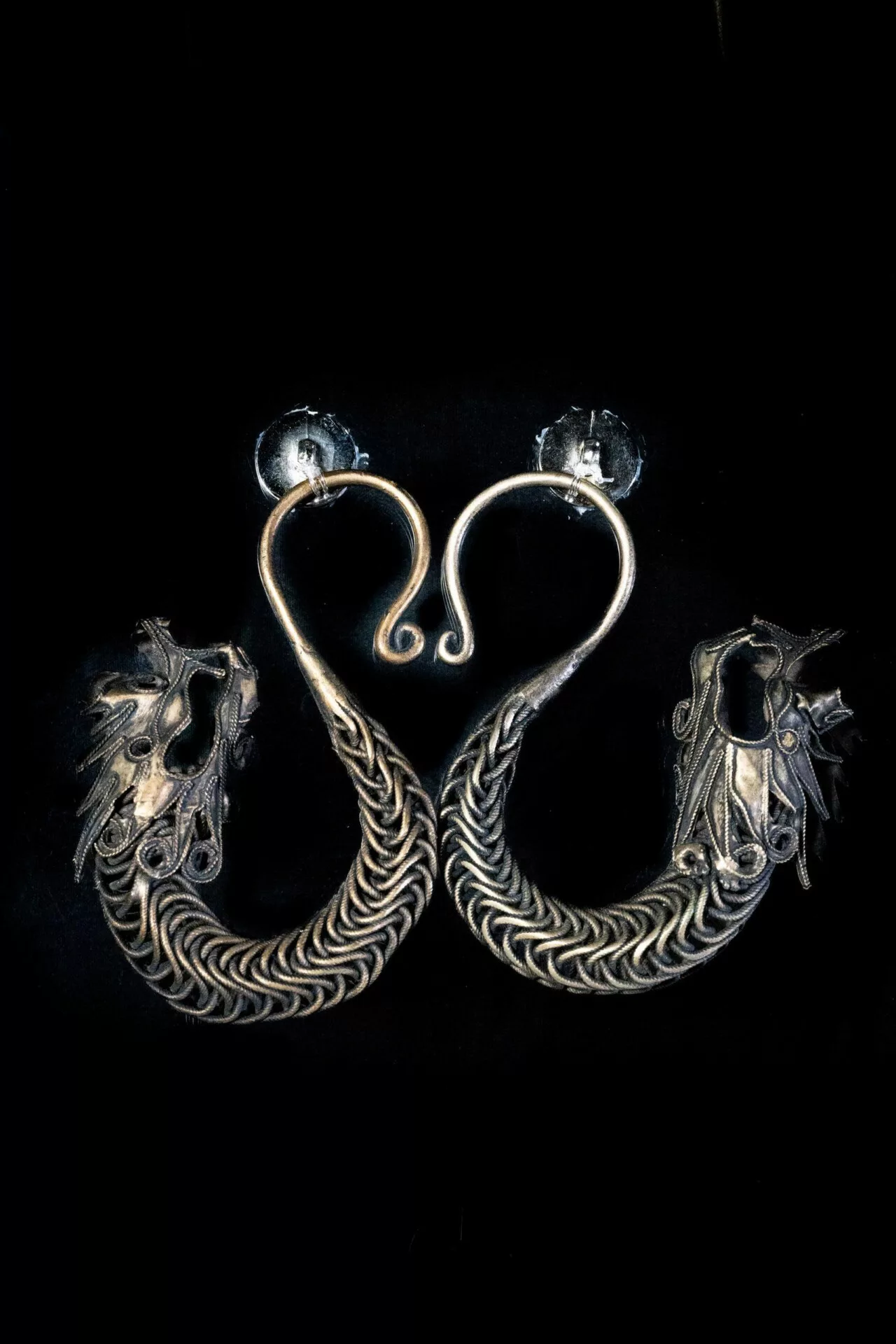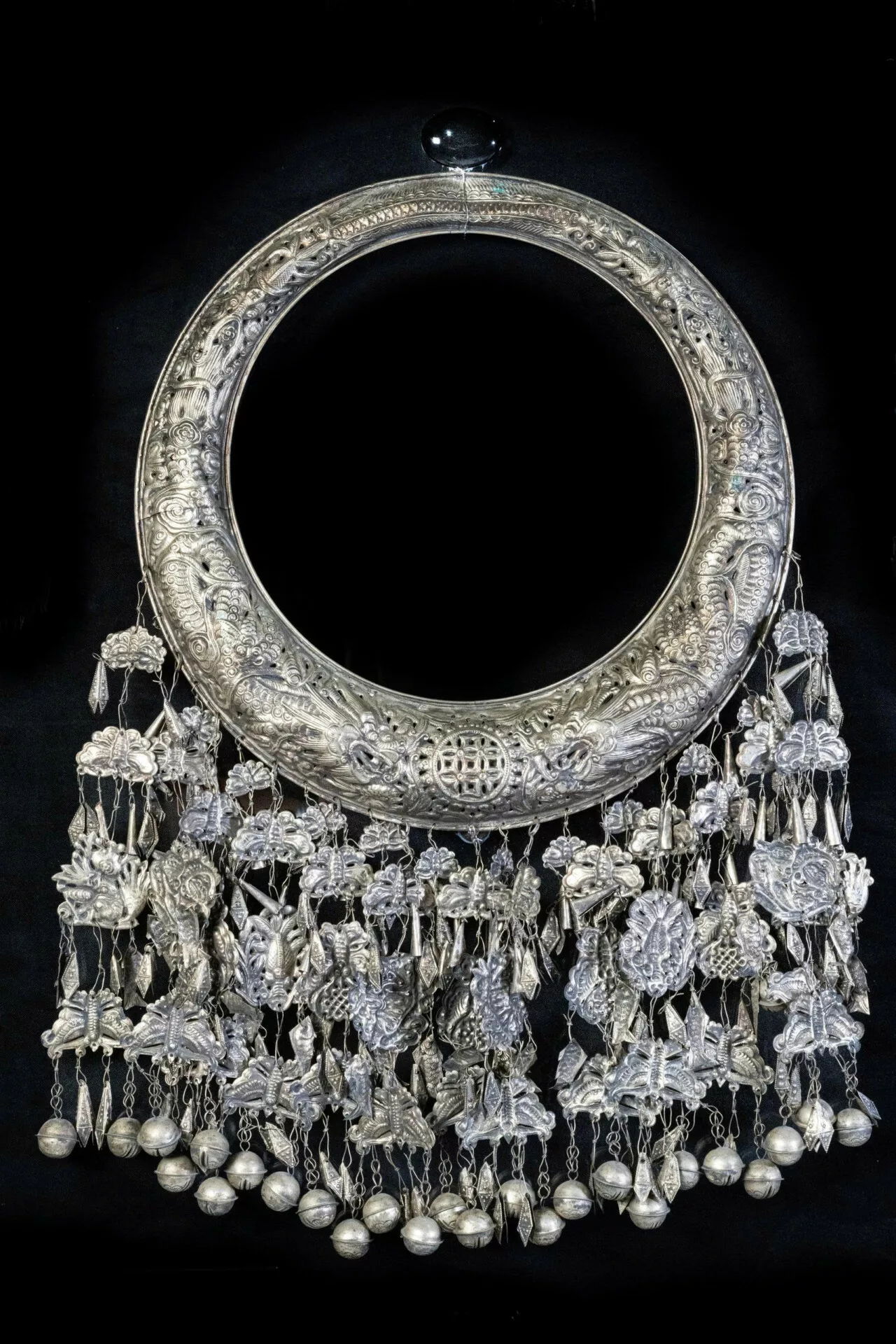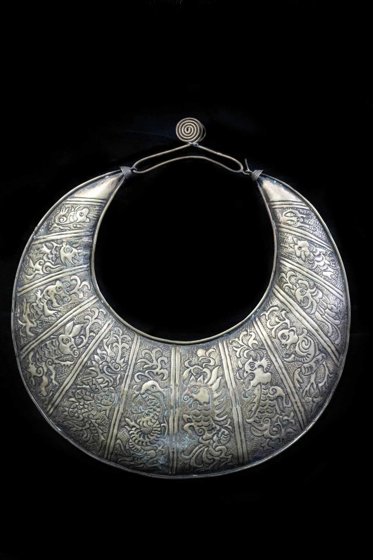 Vòng cổ: Trang sức bạc tổng hợp được tạo tác kỹ thuật điêu khắc với vẻ đẹp cầu kỳ, huyền bí trong điển tích dân tộc H’Mông.