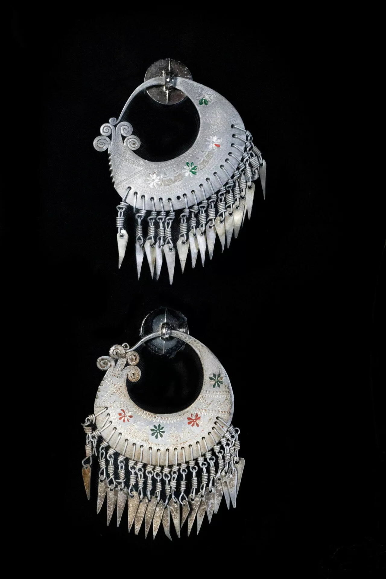Vòng cổ: Chất liệu bạc tổng hợp được cán mỏng nguyên tấm. Mặt dưới được dán chặt vào bởi tấm nhựa cây rừng, mặt trên được hội họa các đề tài trang trí và dùng các cây đục bằng sắt không bén và dùng một thanh gỗ gõ xuống các họa tiết cho đến khi hoàn hảo sẽ tháo lớp nhựa cây ra và kết thúc bằng đánh bóng. Kỹ thuật tạo tác này có độ khó, tỉ mỉ, khéo tay cao nhất trong các kỹ thuật trang sức.