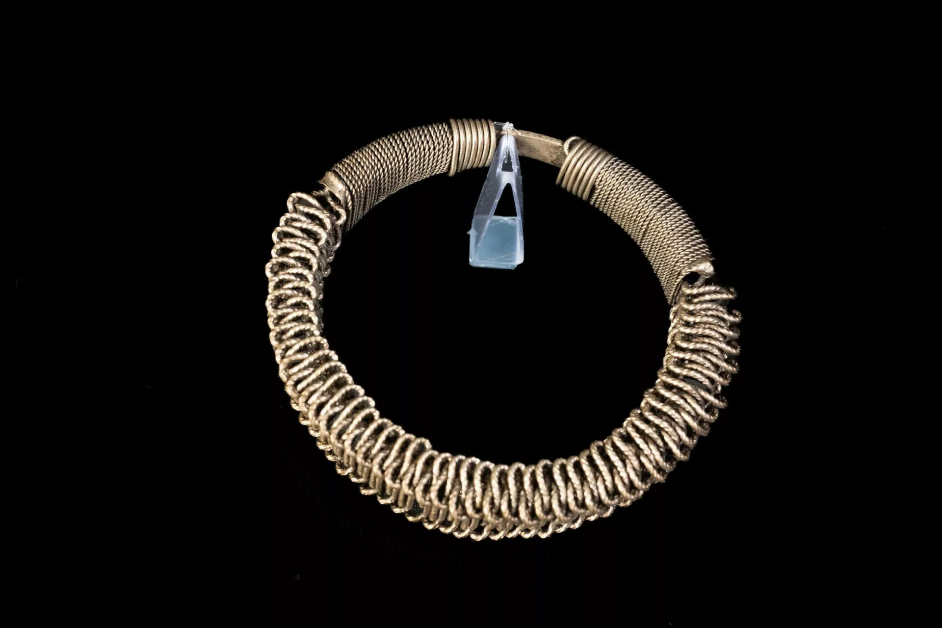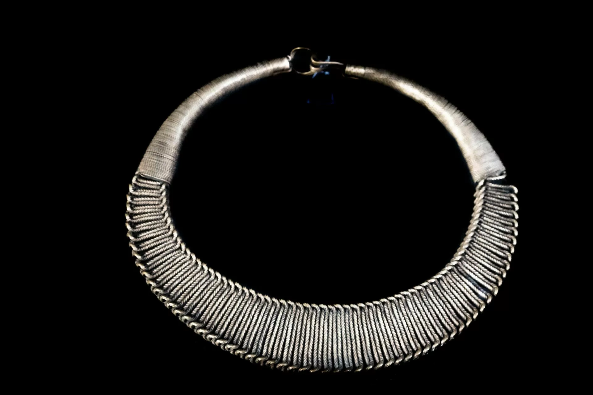 Vòng cổ: Chế tác từ hợp kim bạc, vòng cổ người Lô Lô là minh chứng cho nghệ thuật kim hoàn truyền thống tinh xảo. Nổi bật với kiểu dáng hình chữ S độc đáo, hai đầu tạo hình như đỉnh kim tự tháp nhọn, tạo nên vẻ đẹp mềm mại mà mạnh mẽ. Phần sau được trang trí công phu bằng hoa văn chạm khắc tinh tế. Vòng cổ không chỉ là trang sức, mà còn thể hiện địa vị và bản sắc văn hóa của người Lô Lô.