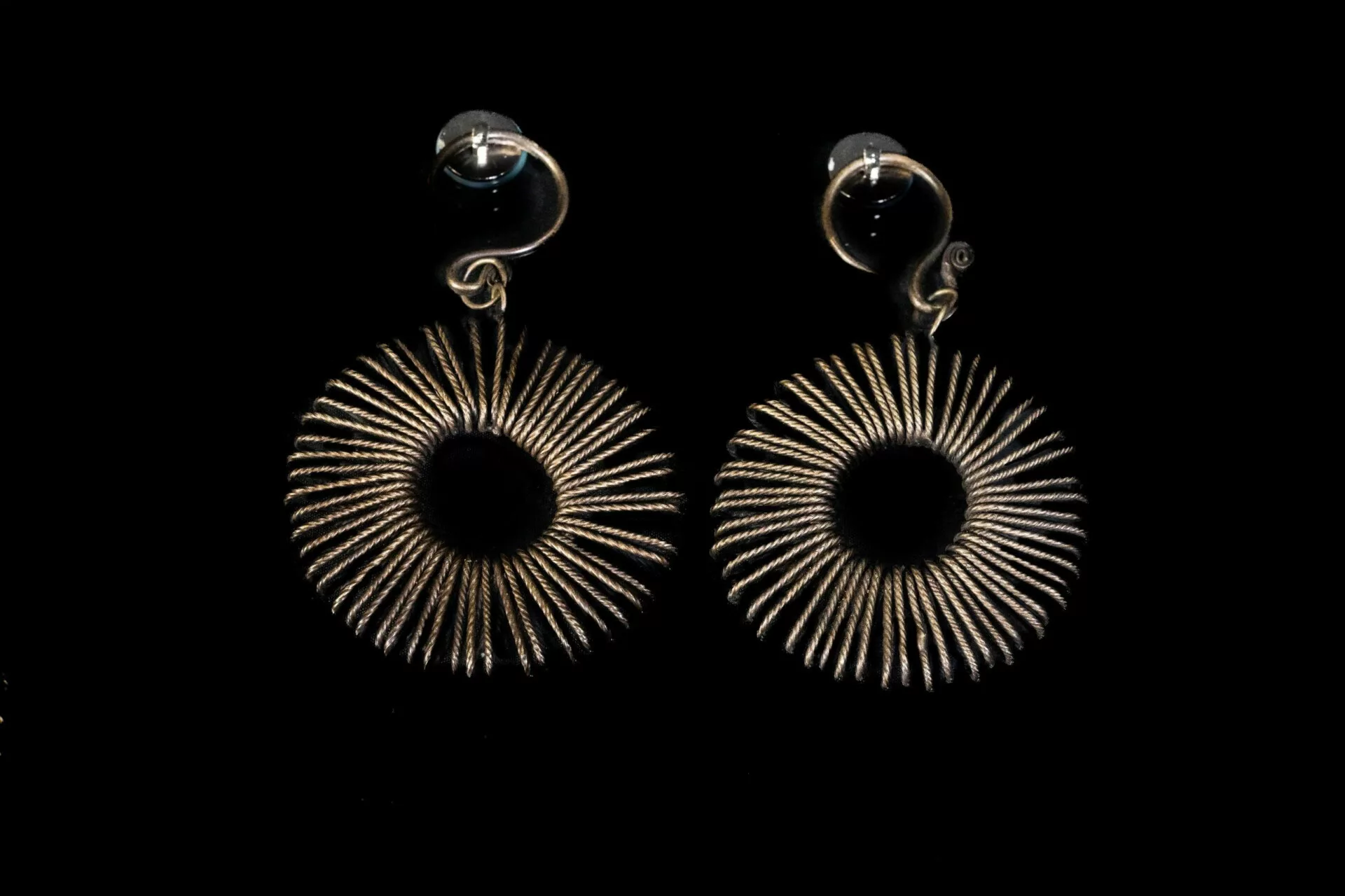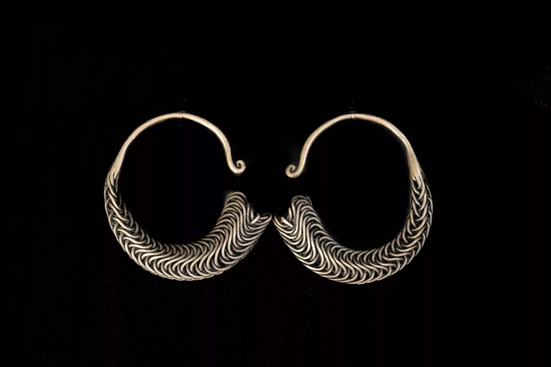 Bông tai: Đa dạng về kiểu dáng, từ hình bán nguyệt đến hình tròn. Nổi bật với những hoa văn chạm khắc tinh xảo, tạo nên độ nổi sinh động trên bề mặt kim loại. Đặc biệt ấn tượng là kiểu bông tai hình tròn với các tia tỏa ra xung quanh, gợi nhớ hình ảnh ánh mặt trời. Thiết kế này thể hiện sự sáng tạo và kỹ thuật chế tác điêu luyện của các nghệ nhân kim hoàn Lô Lô.