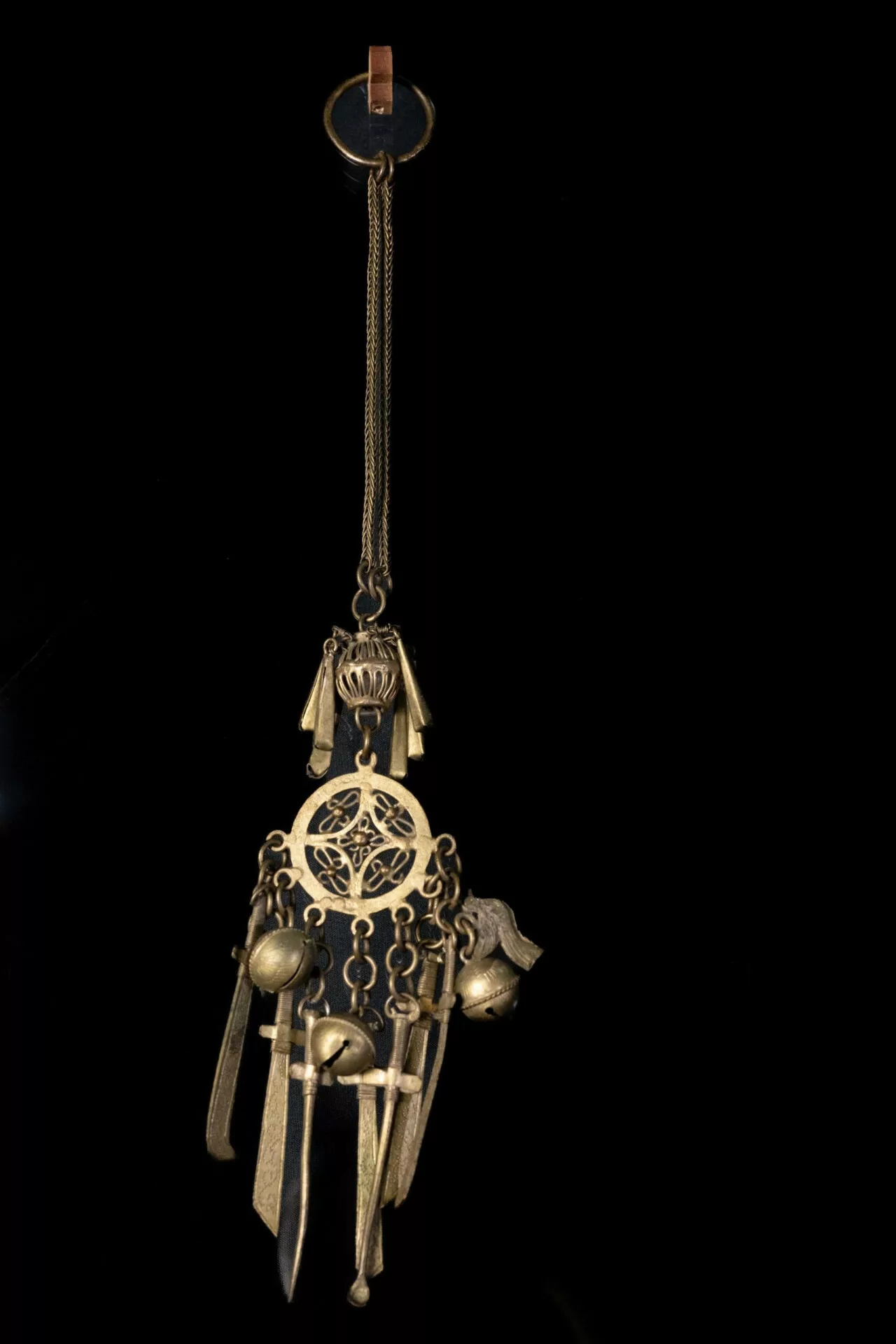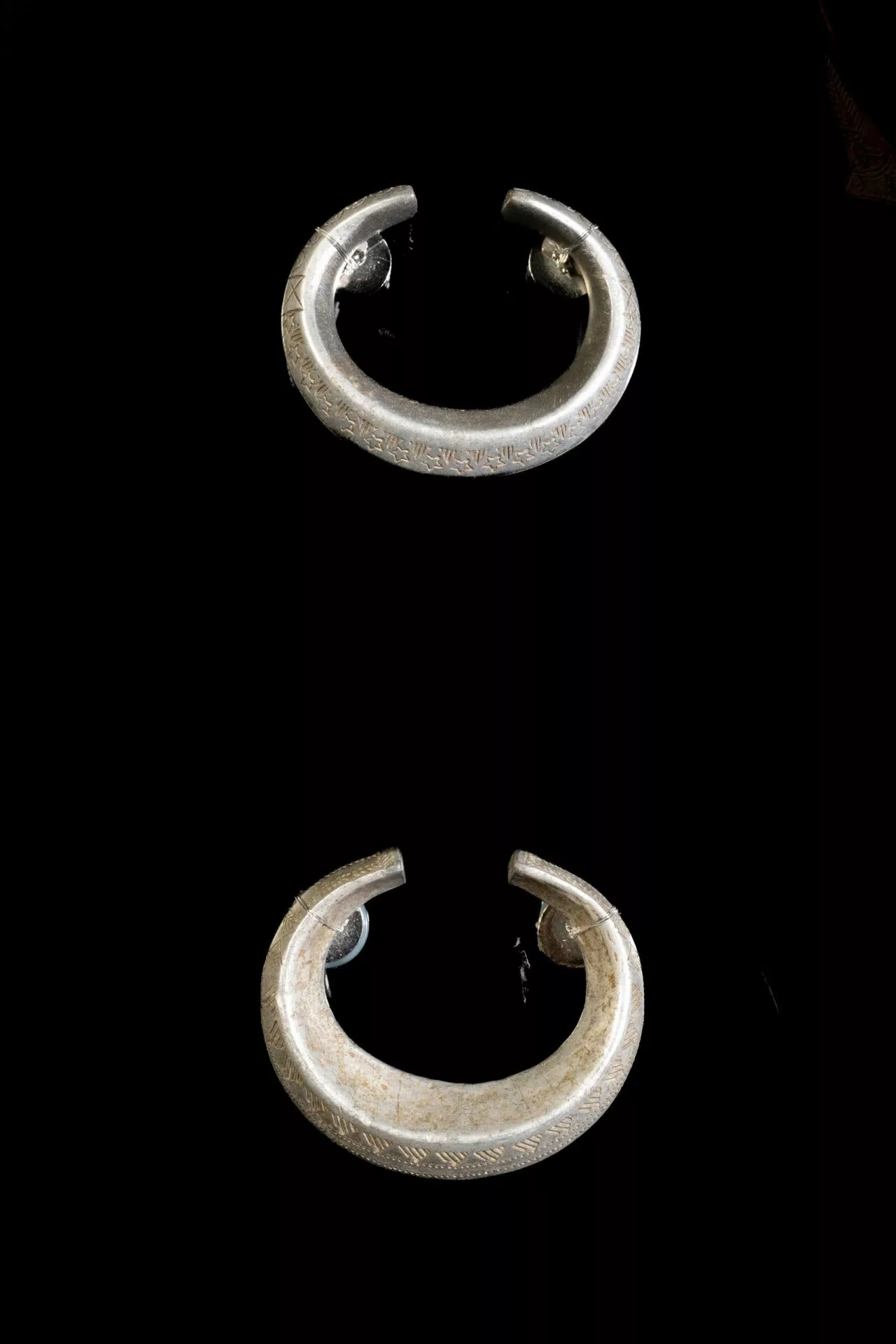 Vòng cổ: Với chất liệu bạc tổng hợp và tạo hình nhỏ dần về hai đầu và cán mỏng ở phần cuối, bên dưới được treo ba tấm hợp kim bạc tổng hợp. Hoa văn điêu khắc kết hợp chữ cổ phản ánh đậm nét tín ngưỡng đa thần và tâm linh người Mảng.