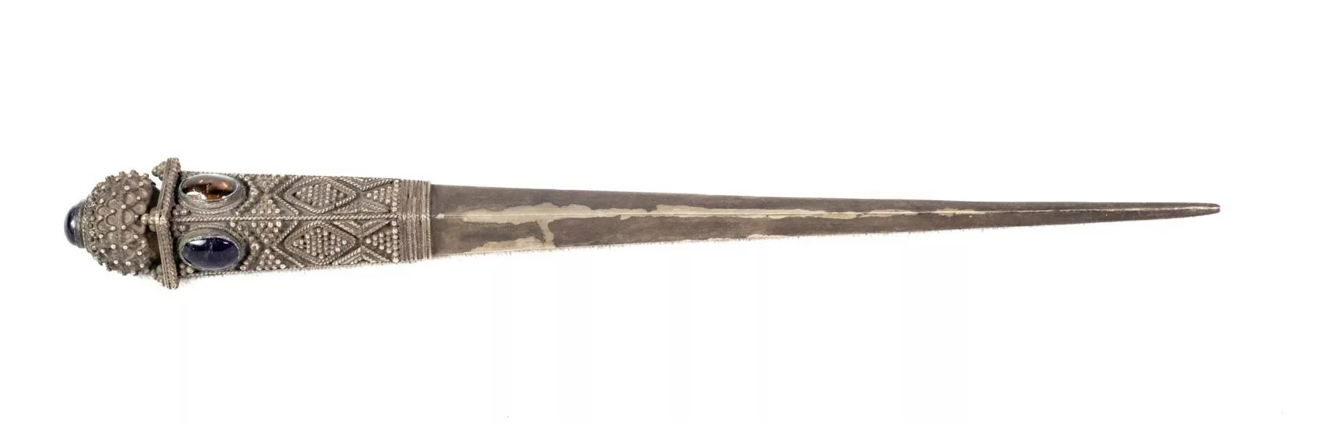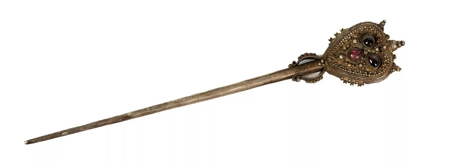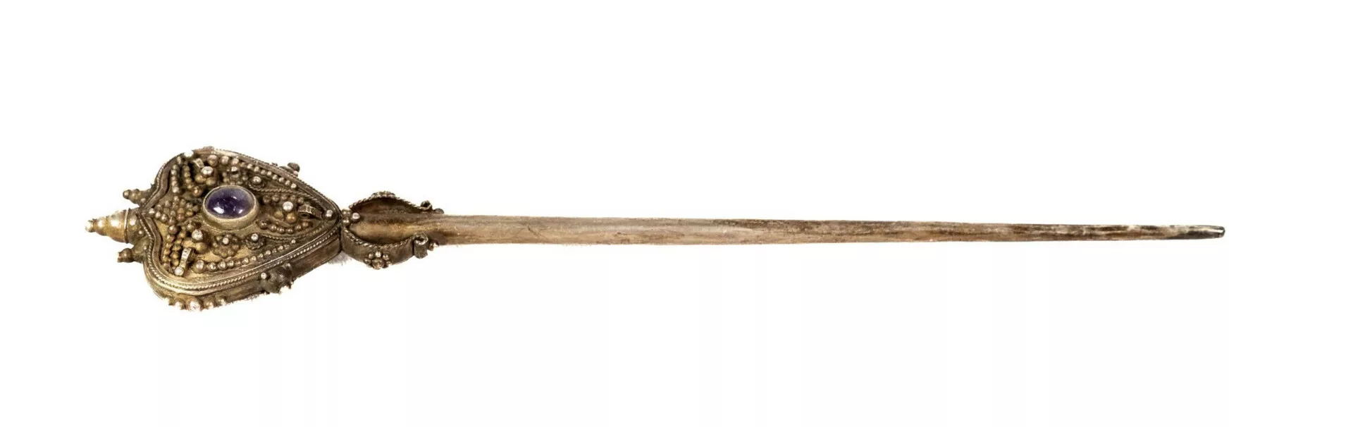 Trâm cài tóc: Đầu trâm gồm các dải bạc đan xen phức tạp, tạo hình học trừu tượng. Các dải uốn lượn tạo mạng lưới tinh tế với khoảng trống nhỏ giữa các dải. Trung tâm đính viên đá thạch anh tím nhỏ làm điểm nhấn. Thiết kế này thể hiện kỹ thuật kim hoàn cao cấp của người Chăm Pa.