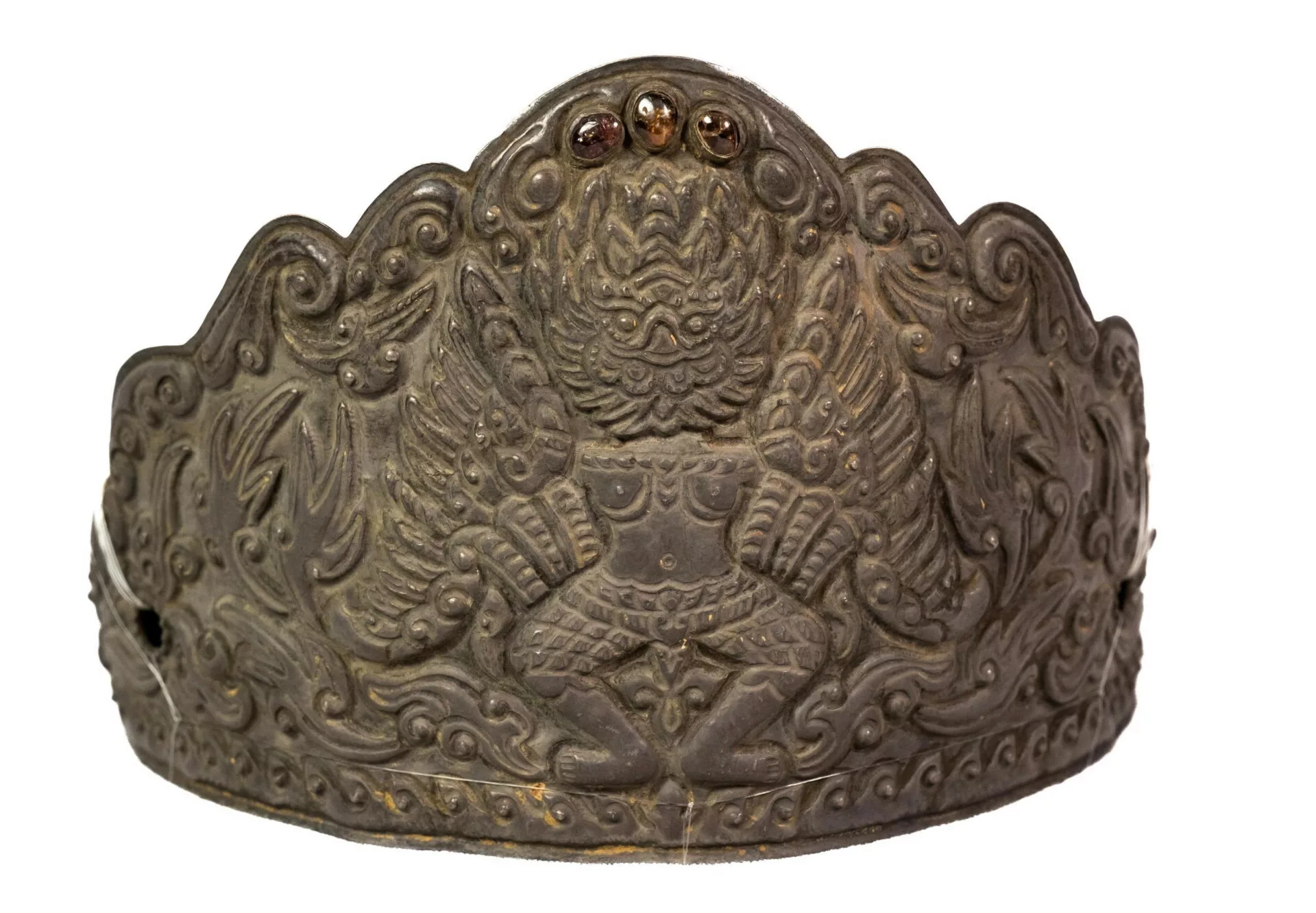 Búi tóc: Thiết kế hình vòng cung, chạm khắc tinh xảo hình chim thần Garuda – vật cưỡi của thần Vishnu. Garuda được miêu tả với đôi cánh xòe rộng, biểu tượng cho sức mạnh và khả năng di chuyển nhanh chóng. Phần trên có hoa văn uốn lượn phức tạp tạo thành vương miện, hai bên có các chi tiết nhỏ như lông vũ. Đây là vật bảo vệ chống lại rắn độc trong Bà la Môn giáo.