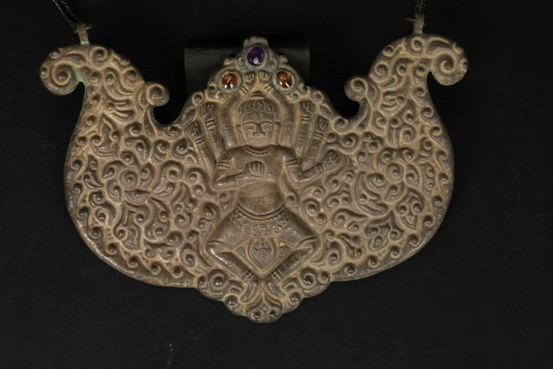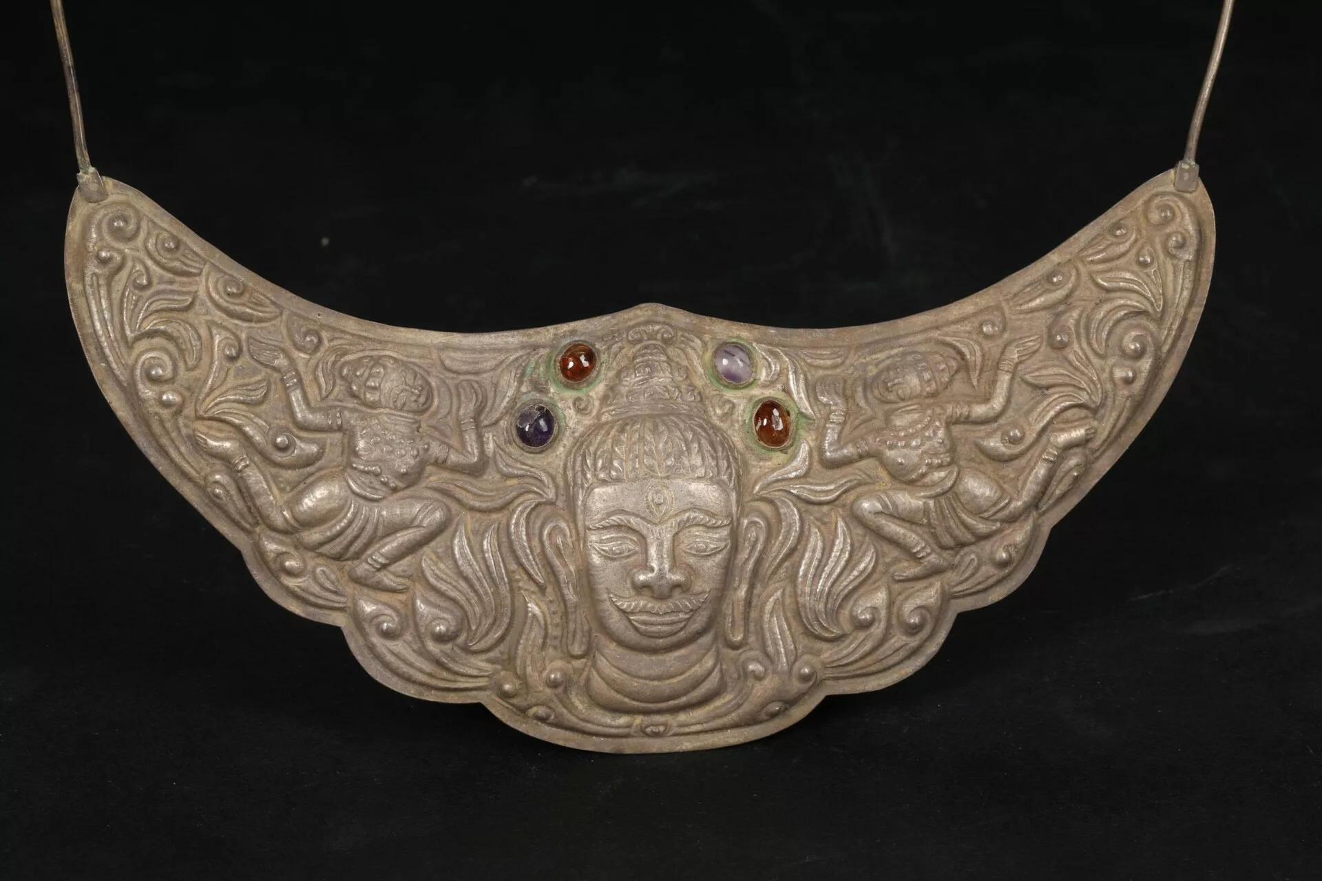 Dây chuyền: Được trang trí với hình ảnh thần Shiva (Pô Ginuơr Mơtri trong tiếng Chăm) ở giữa, thể hiện vị thần tối cao trong tín ngưỡng Chăm. Shiva được miêu tả với ba mắt, tượng trưng cho trí tuệ toàn năng, và đội mũ Jata-Mukuta đặc trưng. Hình ảnh này thể hiện niềm tin vào sự bảo hộ thiêng liêng của Shiva đối với vương quốc. Hai bên là hình ảnh Nataraja – vũ điệu vũ trụ của Shiva.