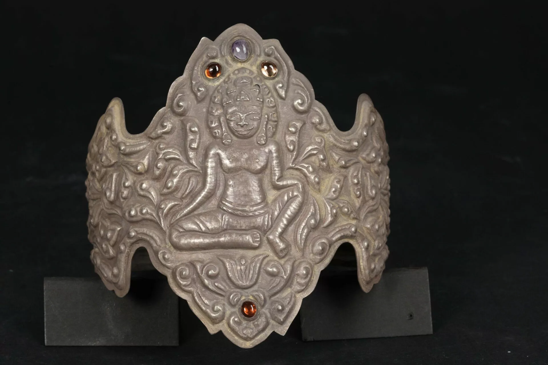 Vòng tay (Bracelet): Vòng tay chạm khắc tinh xảo, miêu tả cuộc đối đầu giữa Garuda và Naga. Trung tâm khắc hình Garuda – sinh vật nửa người nửa chim đại diện cho bầu trời, trong tư thế chiến đấu. Xung quanh là hoa văn uốn lượn tượng trưng cho Naga, đại diện cho đất. Sự kết hợp này thể hiện mối quan hệ đối lập nhưng cân bằng trong vũ trụ. Thiết kế tinh vi không chỉ cho thấy kỹ thuật bậc thầy mà còn ẩn chứa ý nghĩa về hành trình tâm linh, quyền lực và trách nhiệm.