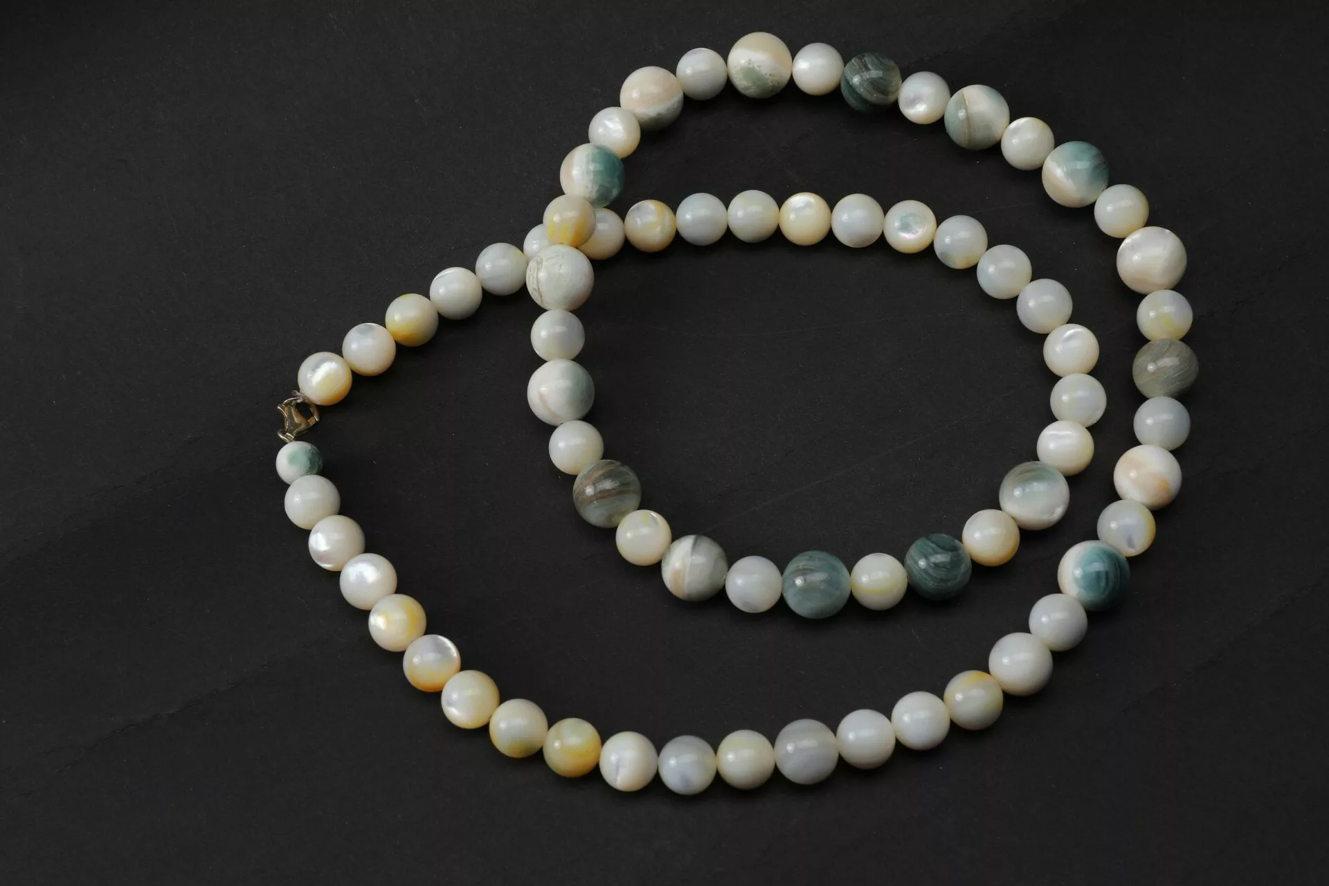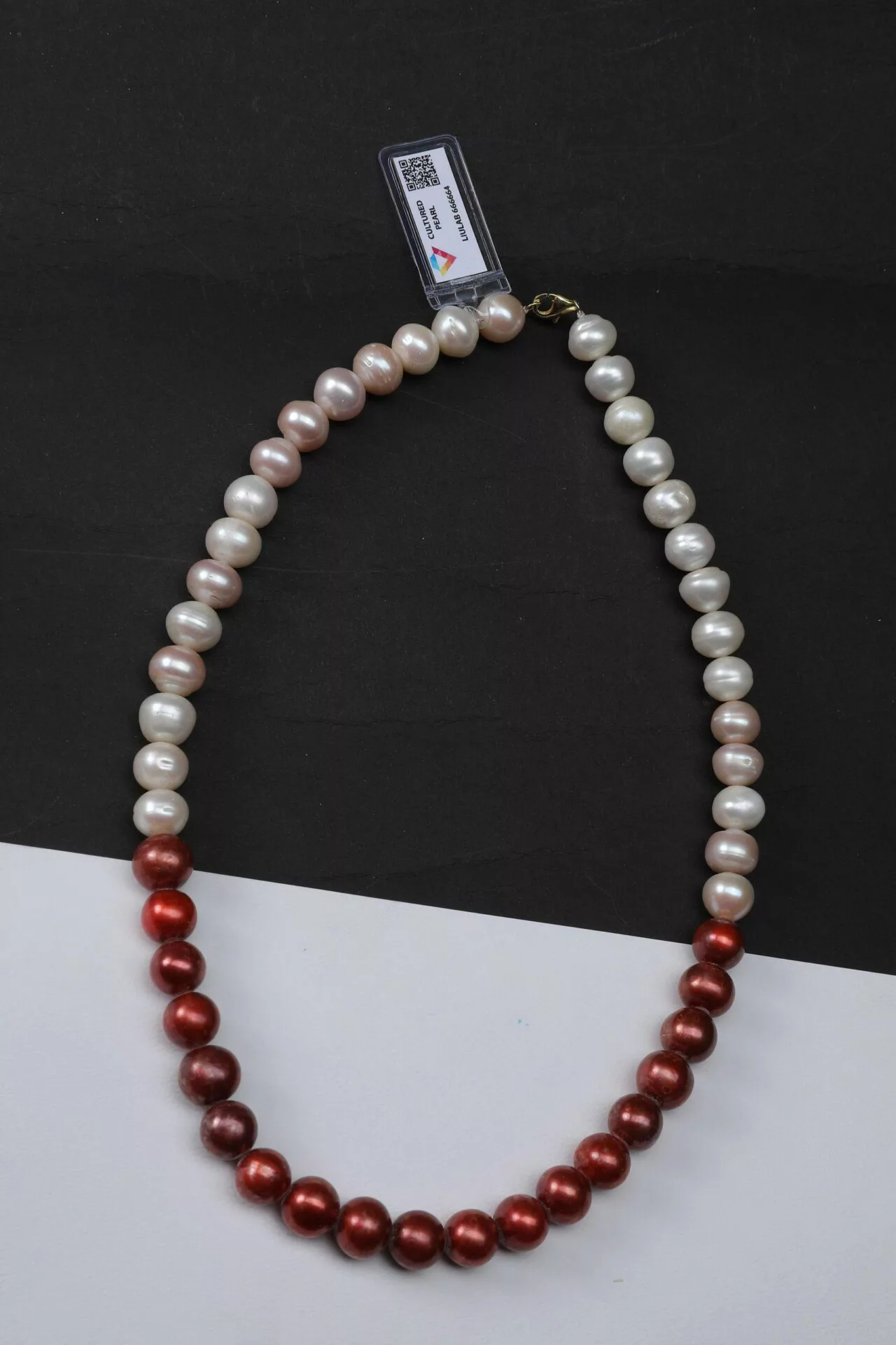 Chiếc vòng cổ hai tầng này kết hợp đa dạng ngọc trai biển tự nhiên với màu sắc phong phú từ trắng ngà, vàng nhạt đến xanh xám. Giá trị của món trang sức nằm ở sự quý hiếm của ngọc trai có kích thước đồng đều và ánh đa sắc đặc trưng – đặc điểm chỉ xuất hiện ở ngọc trai trưởng thành trong môi trường biển tự nhiên lý tưởng.