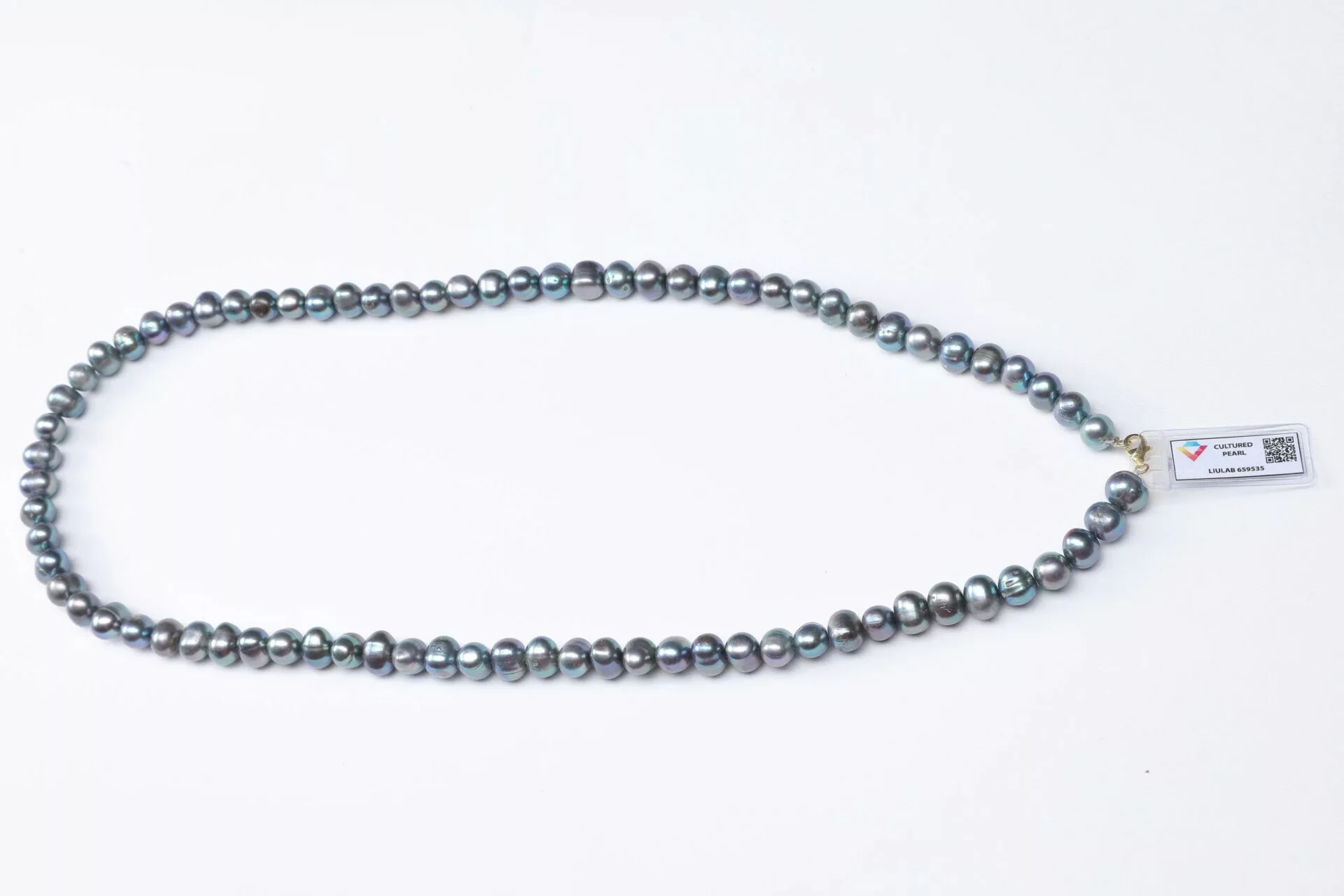 Chuỗi ngọc trai đen ba tầng này thể hiện đỉnh cao mỹ thuật ứng dụng cuối triều Nguyễn. Ngọc trai đen – loại được sử dụng mang giá trị đặc biệt do đặc trưng bởi sắc đen ánh xanh tự nhiên hiếm có.