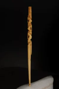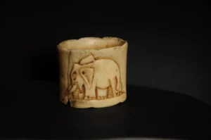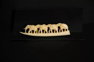 Một trong những kiệt tác nổi bật là chiếc ngà voi khắc cảnh đàn voi đang di chuyển. Tác phẩm thể hiện khung cảnh sinh động với đàn voi được sắp xếp theo đội hình. Hình tượng voi được khắc họa chi tiết và sống động, từ dáng đi uy nghi đến những nét biểu cảm tự nhiên của từng con vật.
