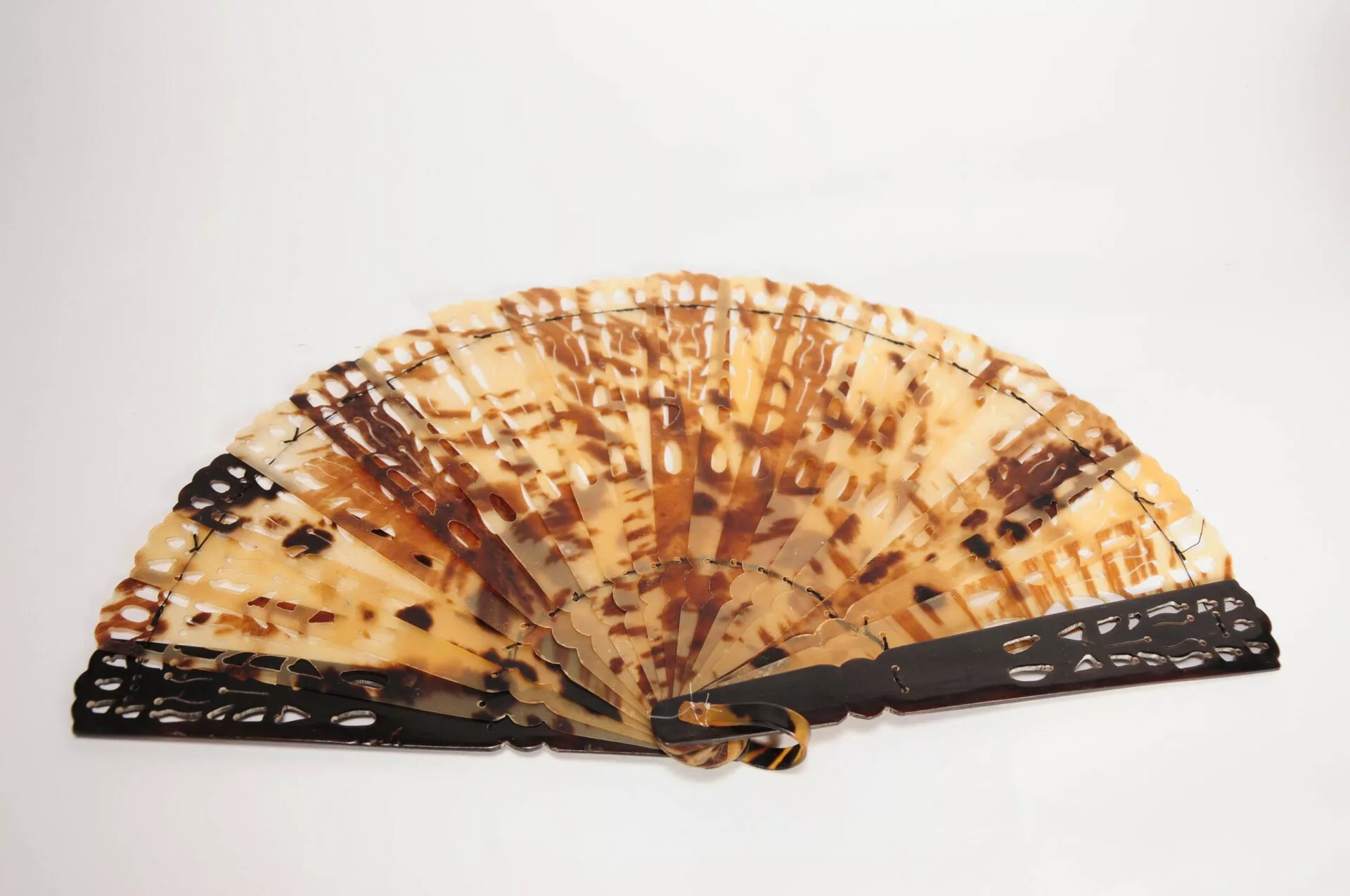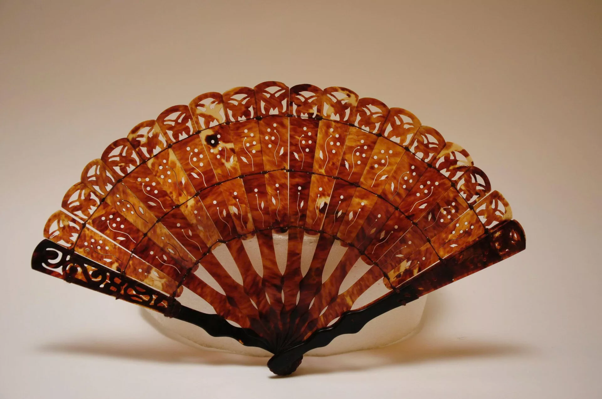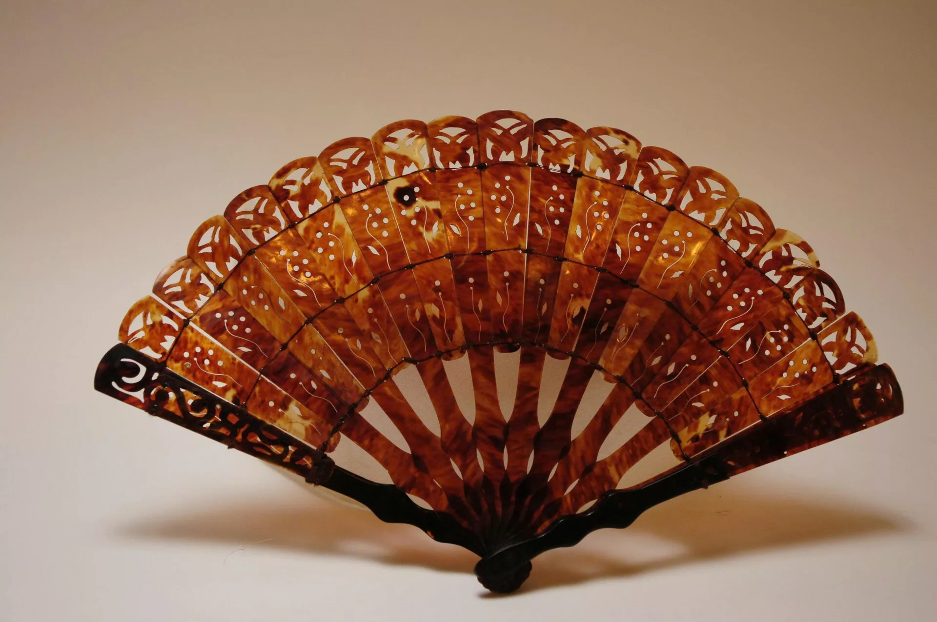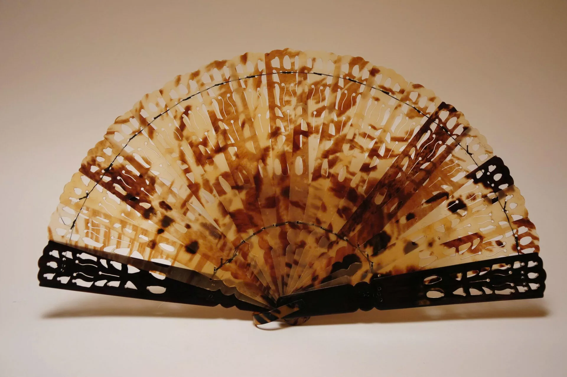 Quạt: Bộ sưu tập trưng bày gồm những chiếc quạt xòe (brisé) được chế tác tinh xảo từ mai đồi mồi, một di sản độc đáo của nghề thủ công Việt Nam. Các quạt có màu nâu vàng đặc trưng của đồi mồi, với những vân đốm tự nhiên tạo nên họa tiết tinh tế trên bề mặt.