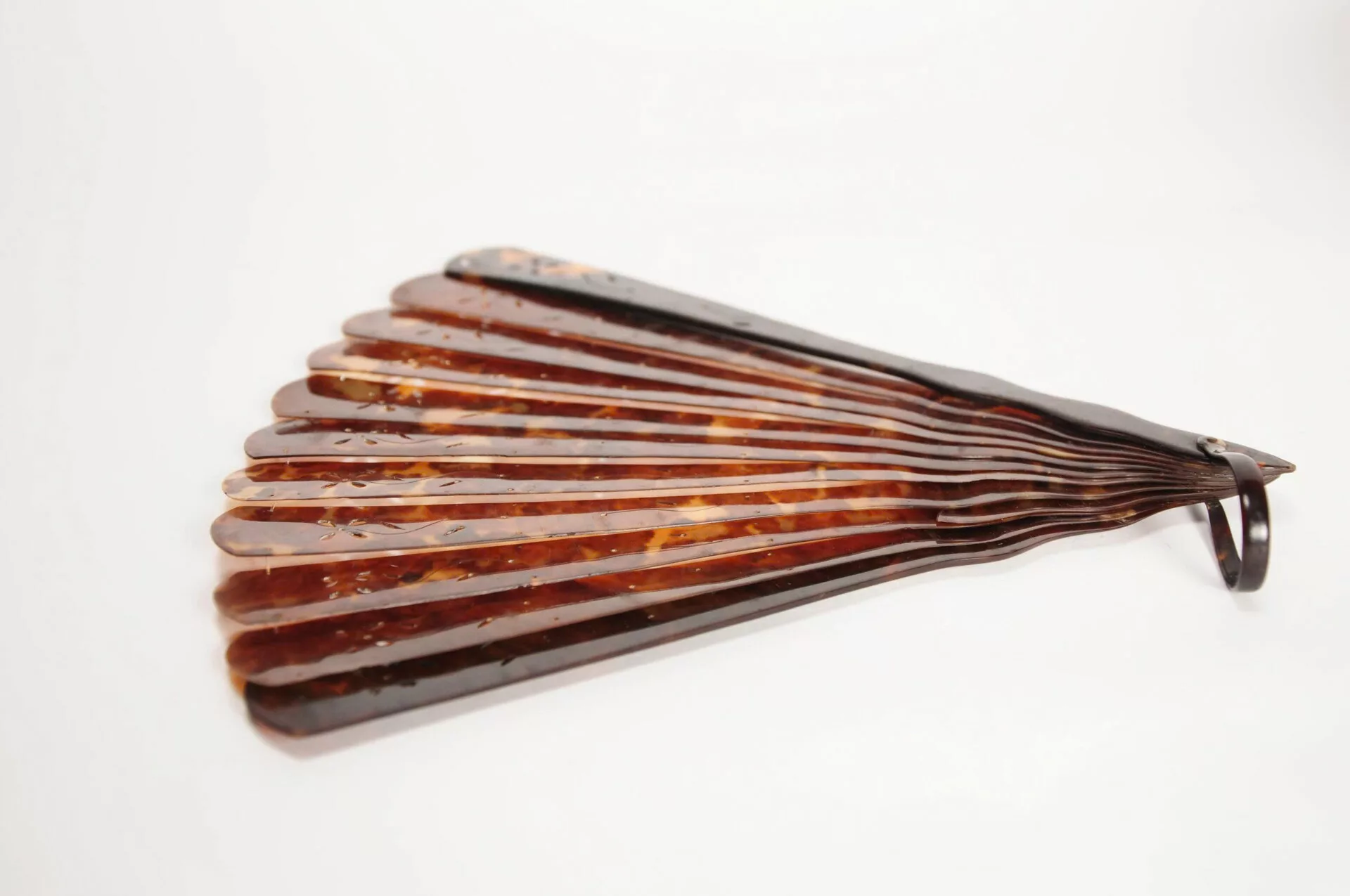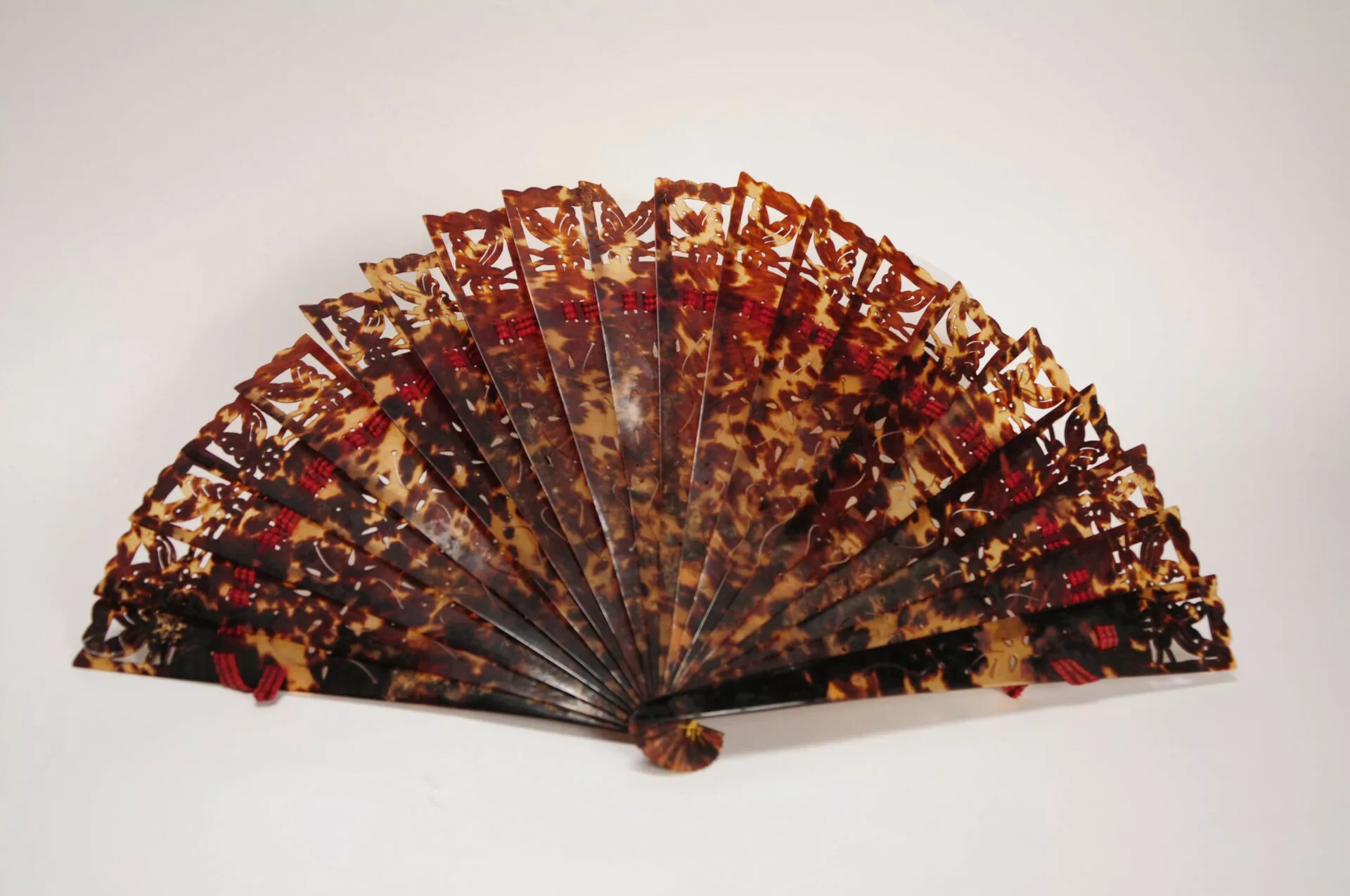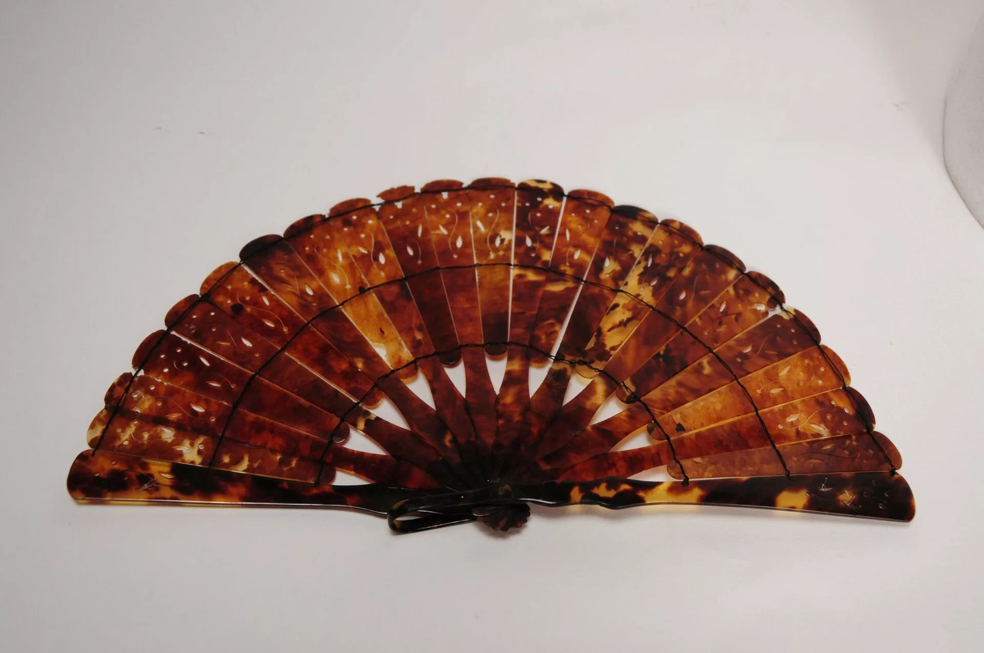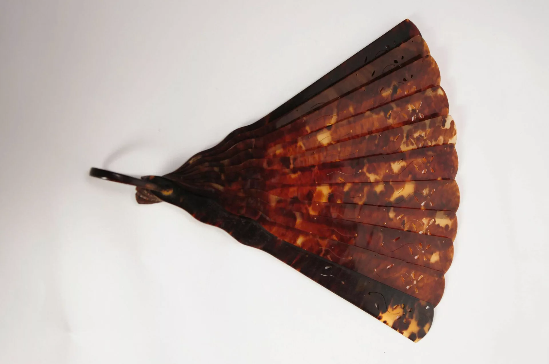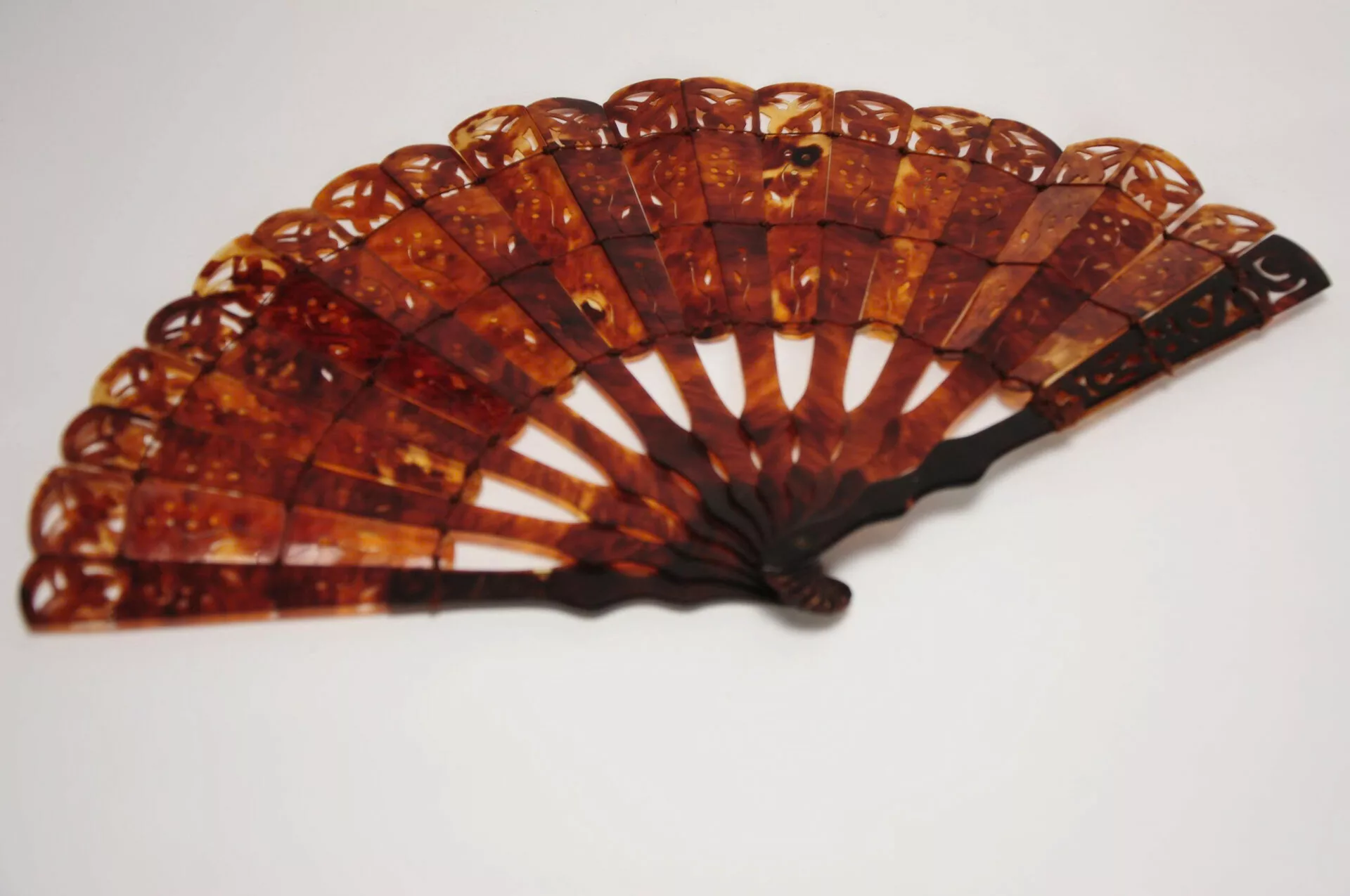 Quạt: Bộ sưu tập trưng bày gồm những chiếc quạt xòe (brisé) được chế tác tinh xảo từ mai đồi mồi, một di sản độc đáo của nghề thủ công Việt Nam. Các quạt có màu nâu vàng đặc trưng của đồi mồi, với những vân đốm tự nhiên tạo nên họa tiết tinh tế trên bề mặt.